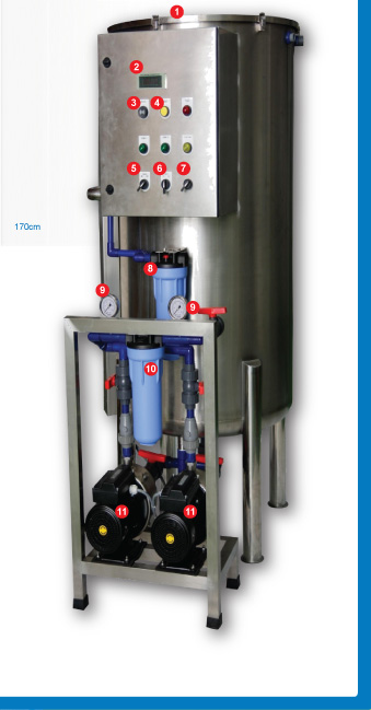 : 500 litres : 20-50 litres / min : 20-50 psi (adjustable) : 220 - 240VAC @ 50hz : 880W (running), 55W (standby) : 75cm x 170cm : 20˚C - 45˚C : 118kgs (pumps and tank, dry) |